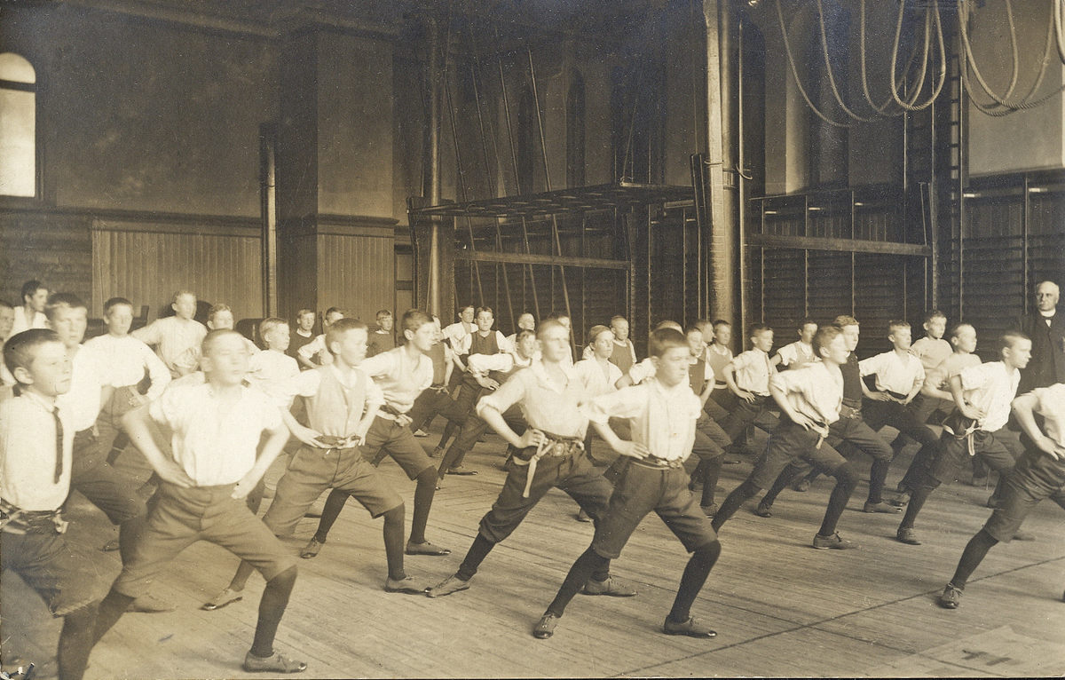 En skolklass (enbart pojkar) övar "höfter fäst" i en gymnastiksal, troligen på Växjö läroverk. Till höger syns gymnastikläraren Olof Bratt.