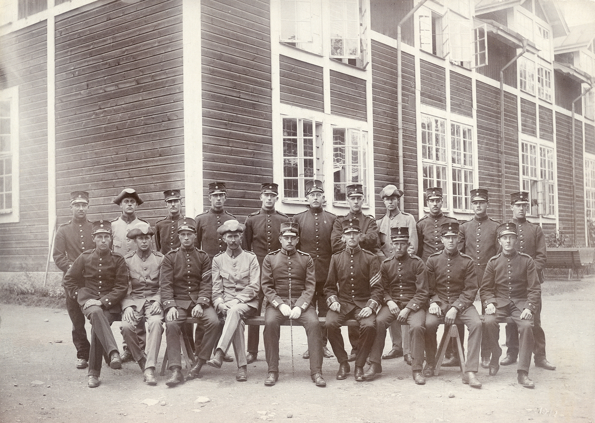 En pluton, iklädda två olika typer av uniform (m/95 och m/10), har ställt upp sig för fotografen vid en barack på Kronobergshed, med kompaniofficeren i mitten.