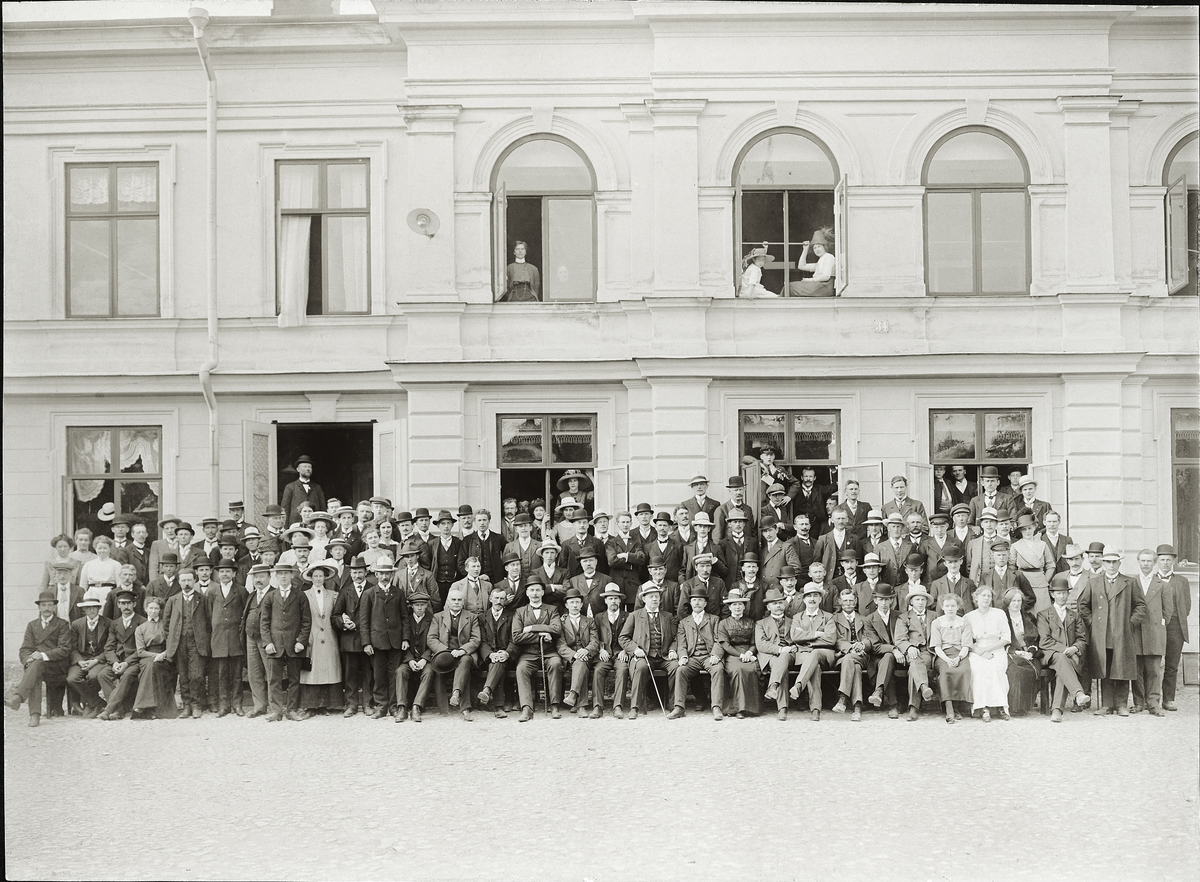 Medlemmarna med familjer har samlats framför (och i) i Godtemplarhuset (IOGT) på Nygatan i Växjö, en sommardag