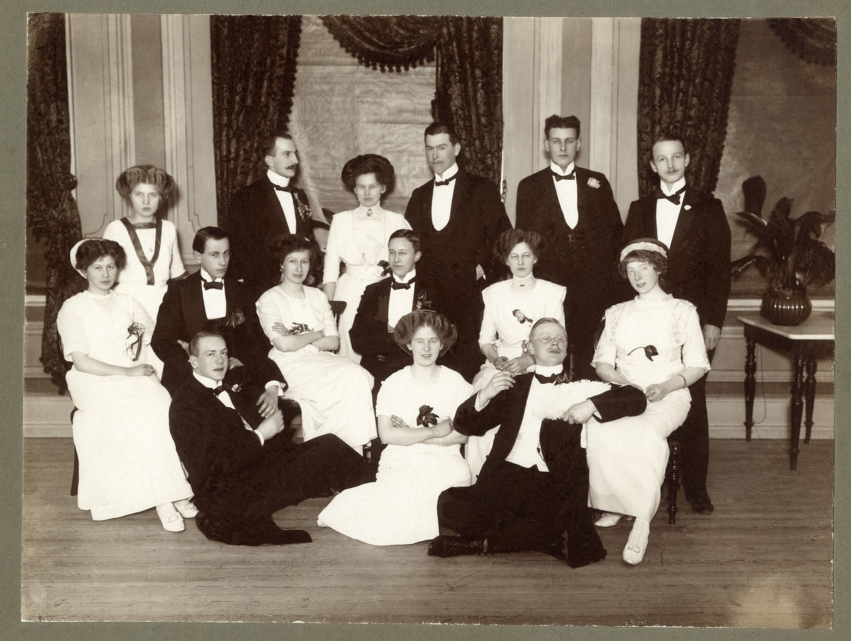 "Skottårs bal i "Stadts" pelarsal 1912. Fr. höger, övre raden: Rudolf Feuk, Gustaf Tausis, Julius Lundberg, Ester Lundberg, f. Feuk, Karl Wahlström, Clara Friman, f. Johnsson.