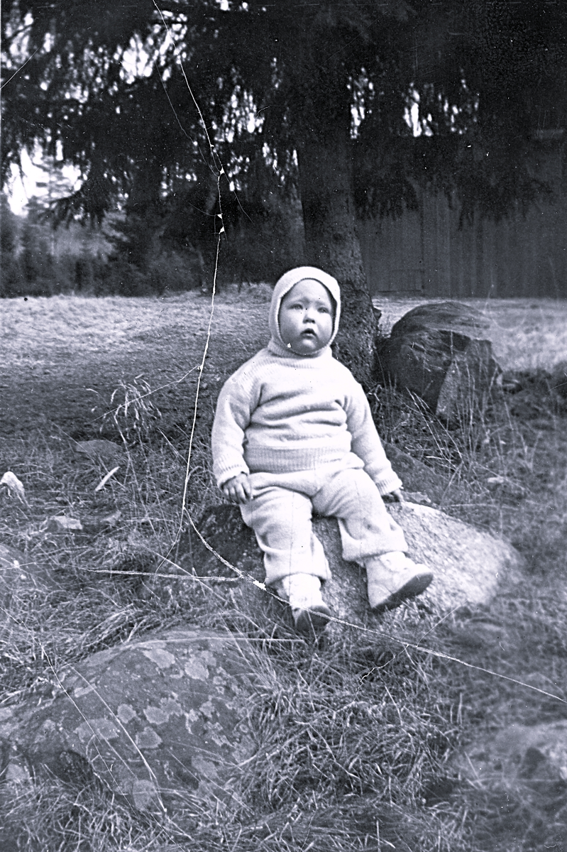 Liten gosse sitter på en sten.
