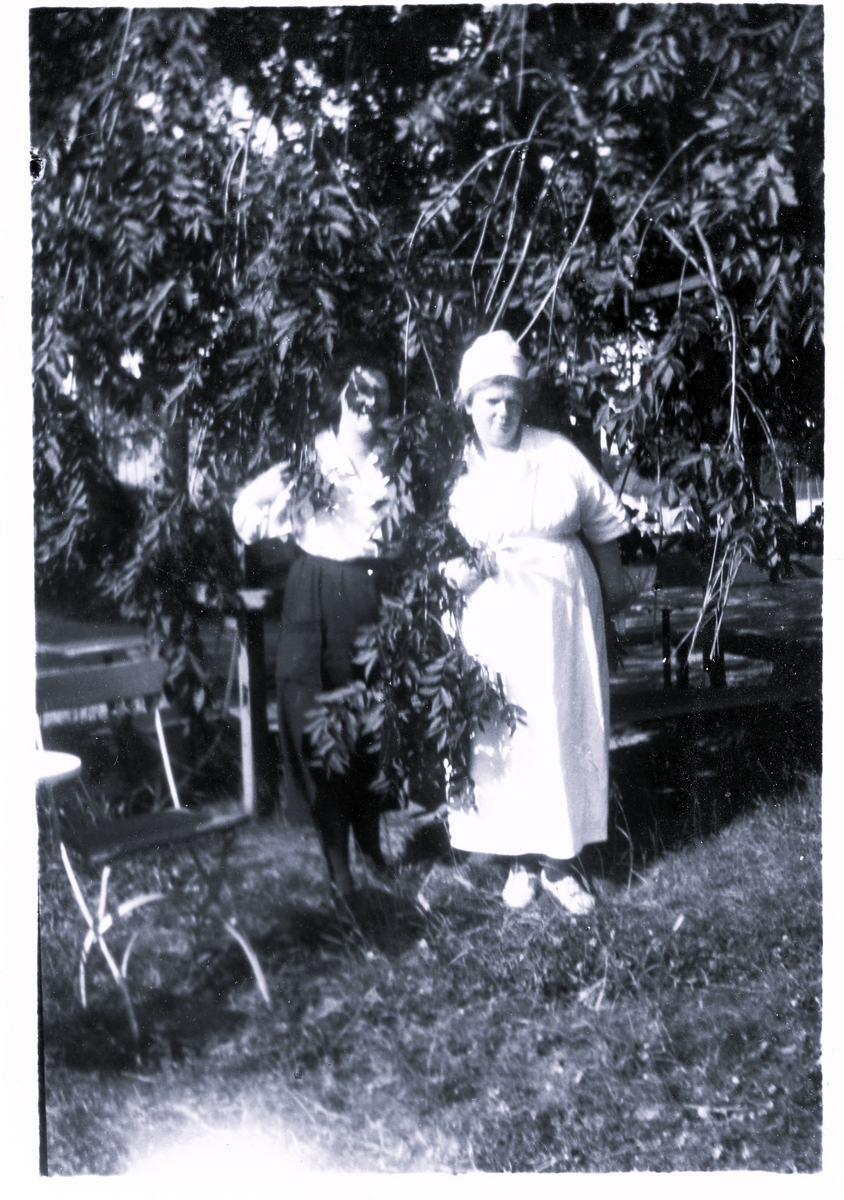 Två kvinnor som står under ett träd. Text vid bild i album: "Ida en servitris, Vaxholm 1924".