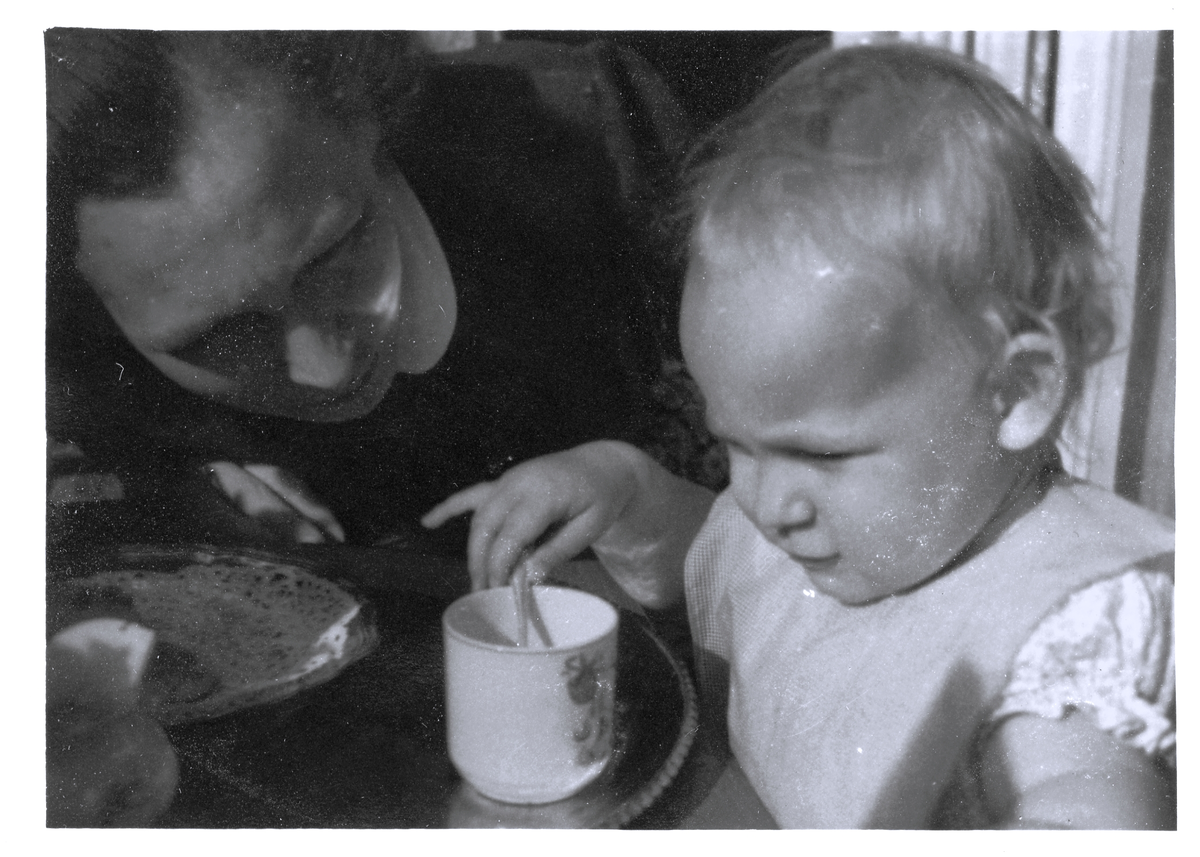 Foto av ett barn och en kvinna. Text vid bild i album: "Agneta m. mamma, 1953".