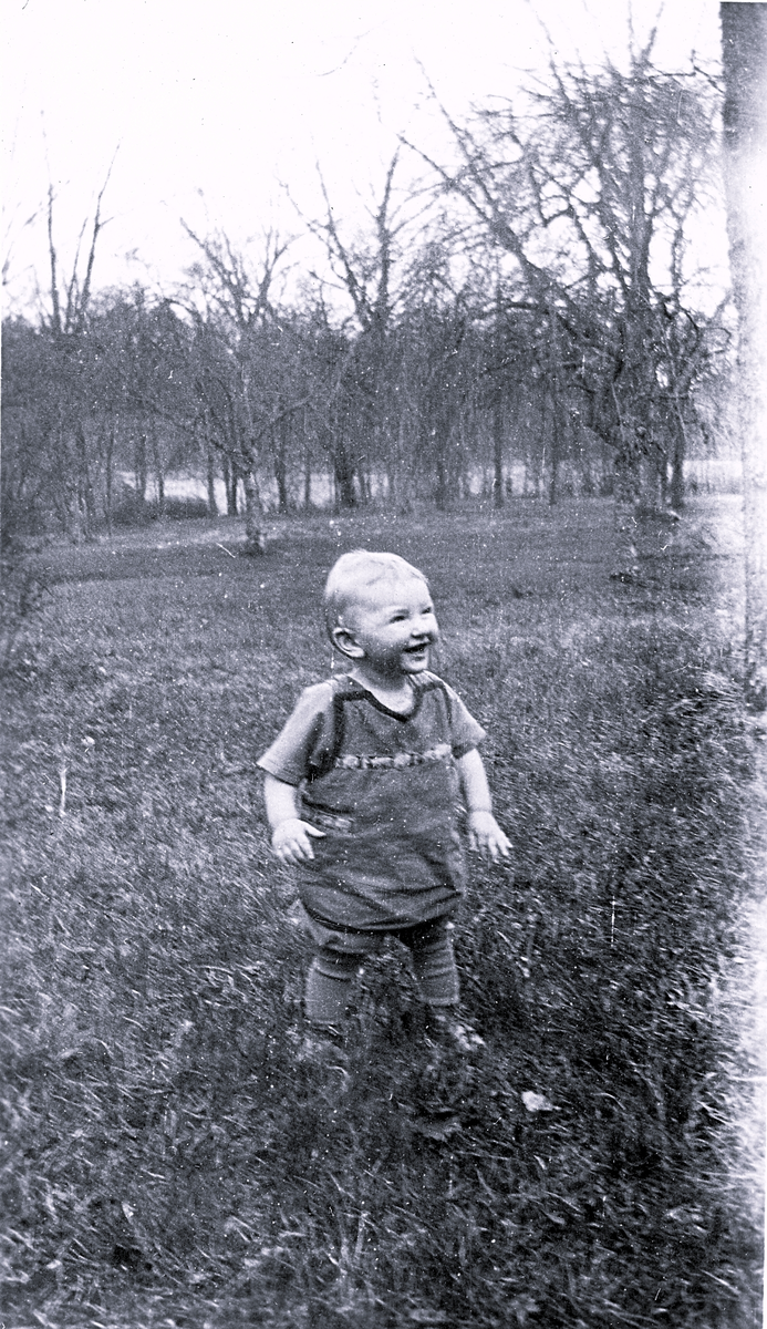 Foto av en gosse på upptäcksfärd. Text baksida kort: "Den 2 maj 1926 Rune på söndagspromenad".