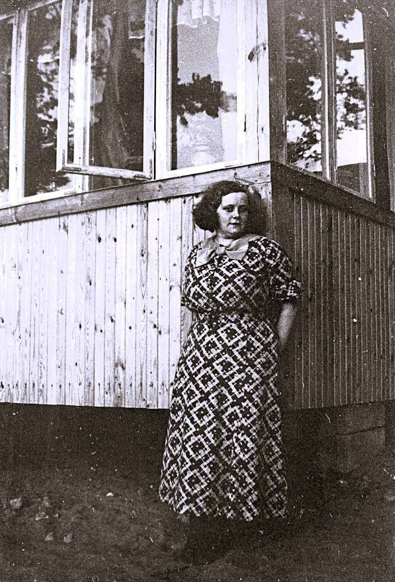 Foto av kvinna som lutar sig mot en husfasad.