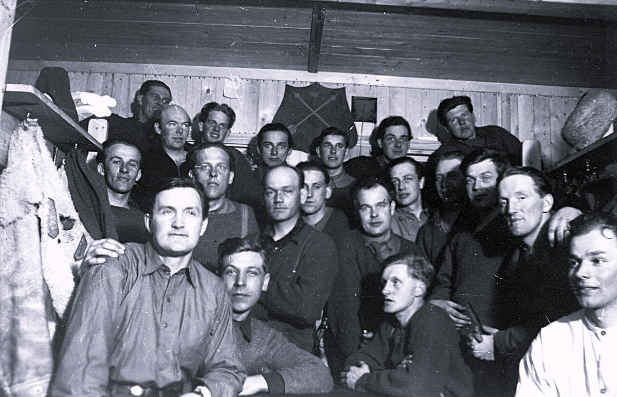 Titel: Ett gäng ledigt klädda värnpliktiga, Dalarnas landskapsvapen sitter avbildad på väggen.