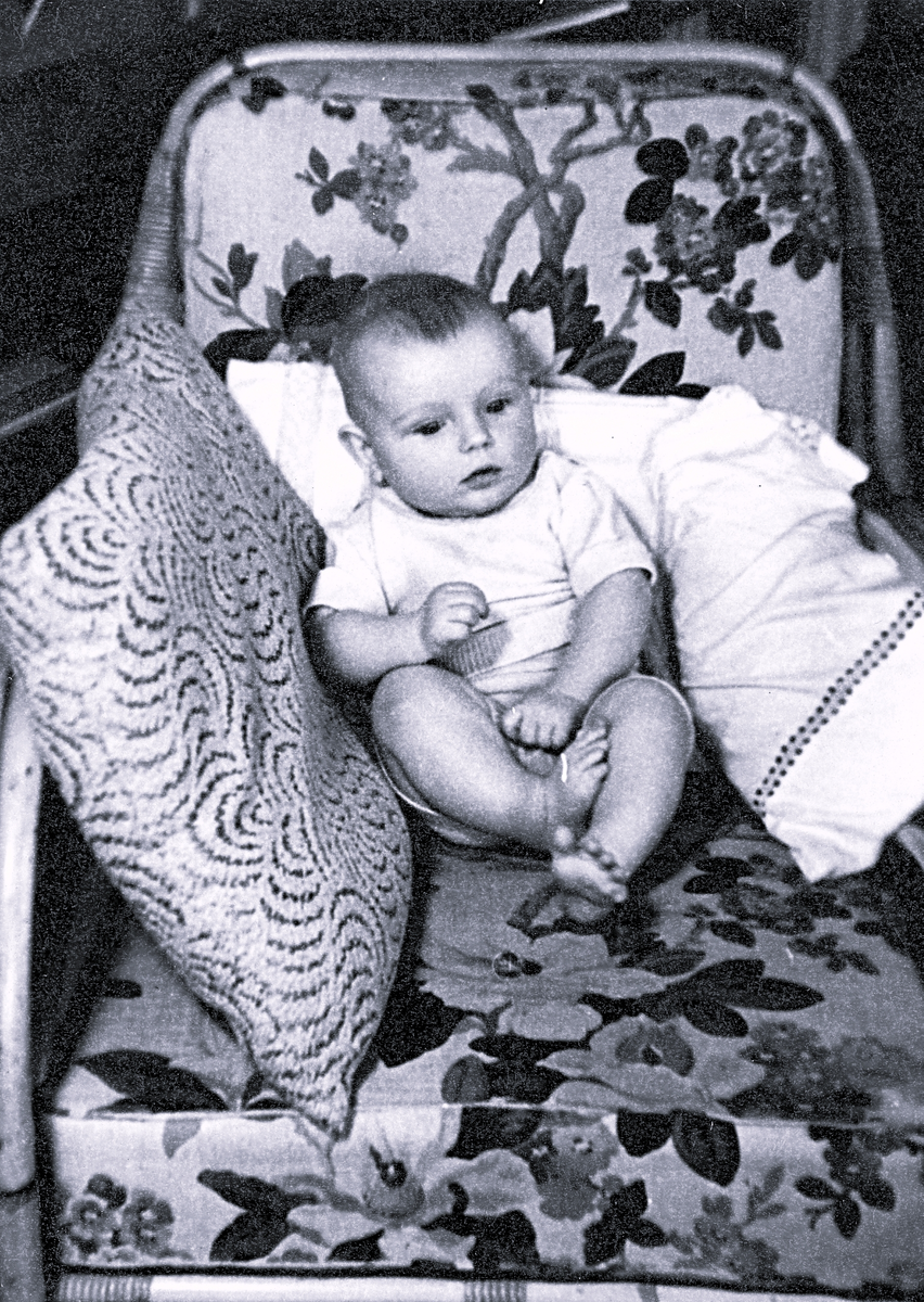Foto av liten gosse som sitter stödd med kuddar i en fåtölj.