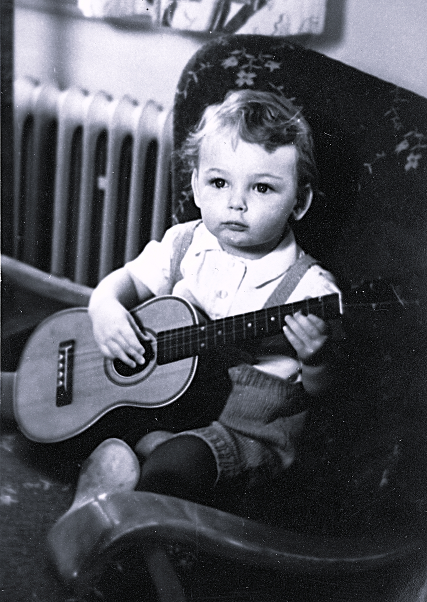 Foto av en gosse som kanske är en blivande gitarrist.