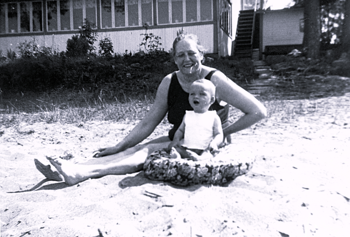 Foto av kvinna och barn som sitter på stranden.