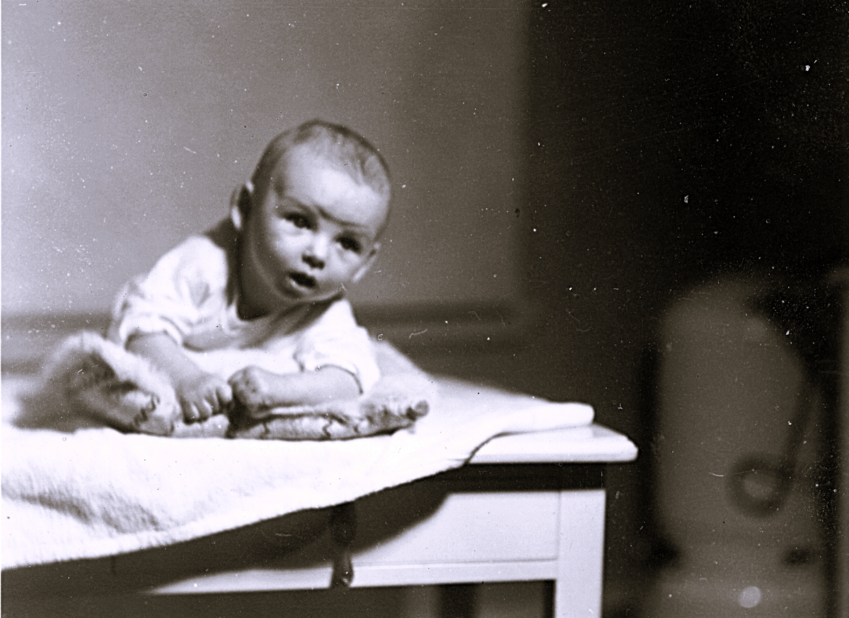 Foto av baby som ligger på mage med kudde under sig. Text baksida kort: "Heja grabbar här kommer Per Olof Skärgård".