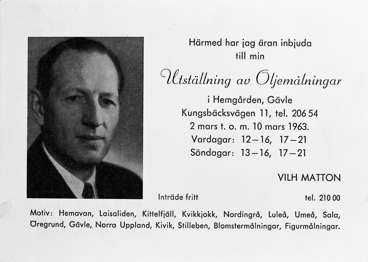 Titel: Inbjudningskort till utställning av Vilhelm Matton. Text på kortet "Härmed har jag äran inbjuda till min Utställning av Oljemålningar i Hemgården, Gävle Kungsbäcksvägen 11, tel. 206 54 2 mars t.o.m. 10 mars 1963. Vardagar: 12-16, 17-21 Söndagar: 13-16, 17-21 VILH MATTON"