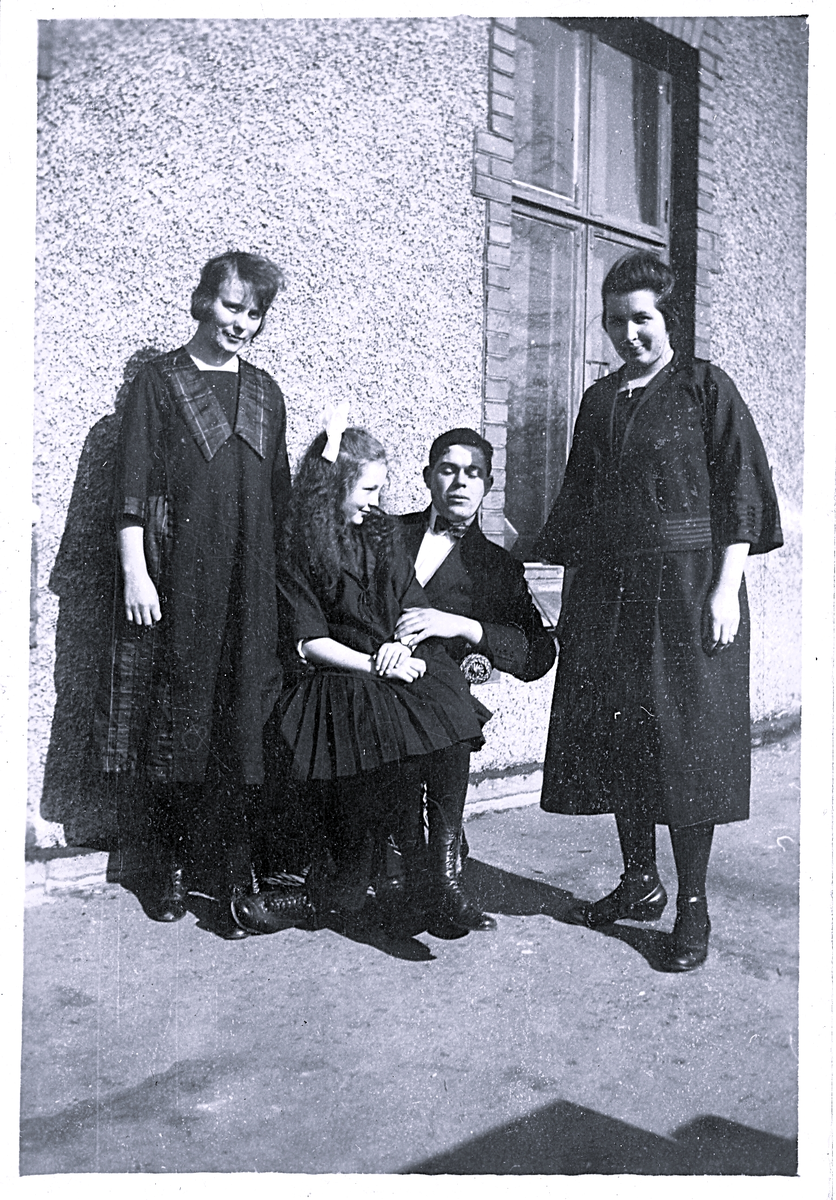 Foto av två kvinnor, en man och en flicka. "Inga i Karl-Emils knä" (enligt text vid bild i album). Text baksida kort: "och dom med".
