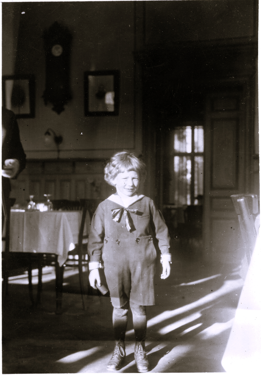 Foto av en gosse. Text vid bild i albumet: "Solstrålen". Text på baksida kort: "Senaste konterfejet av källarmästarn på Sandvikens Hotell, han är väl bekant, han står mitt i solen så han grinar opp sej".