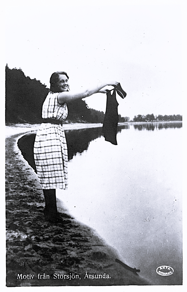 Motiv från Storsjön, Årsunda. Bildtext i album: "Faster Inga". Text baksida kort: "Kära Olof, Köp 10 kg gelantin på N.K glömde anteckna det. Hälsningar mamma. Adresserat till Herr Olof Svensson, Stockholm".