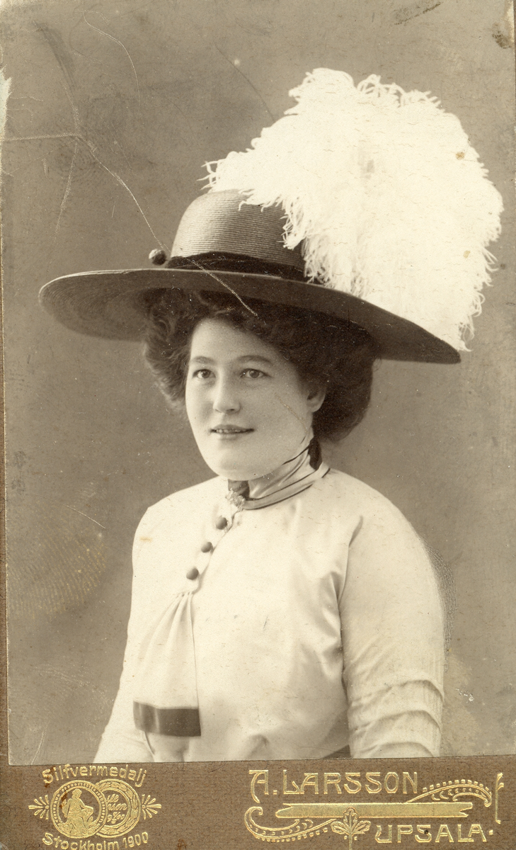 Foto av Olles enda kärlek o.s.v hatt och hår den tidens mode 1910 (enligt text skriven i albumet).