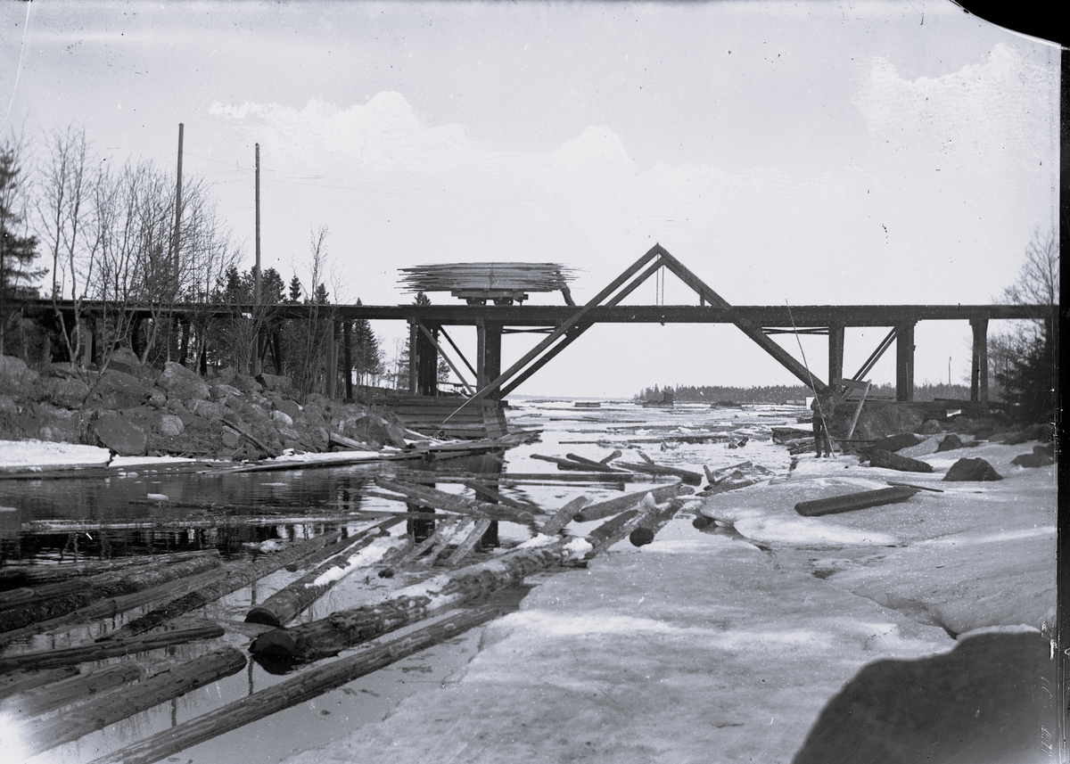 Märkt "Bron. u. Sågen". Vy över en transportbro över timmerstockar och vatten.