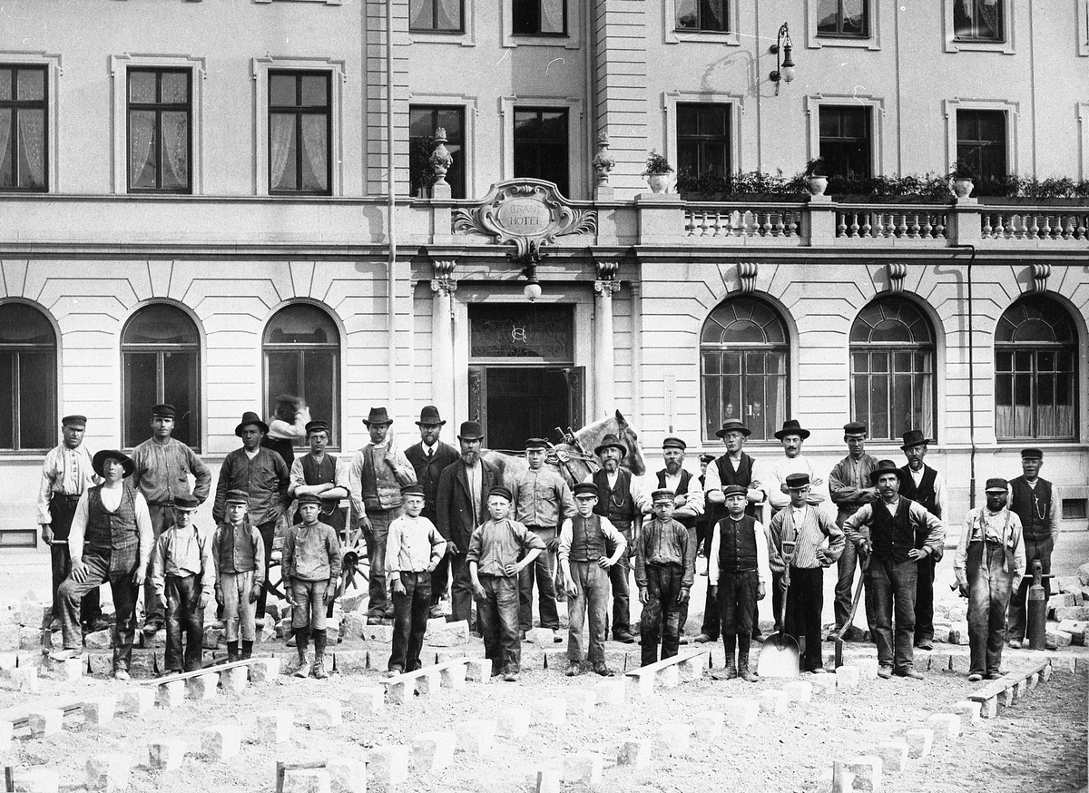 Titel: Stensättare samt barnarbetare i arbete med att sätta gatsten utanför Grand Hotell i Gävle.