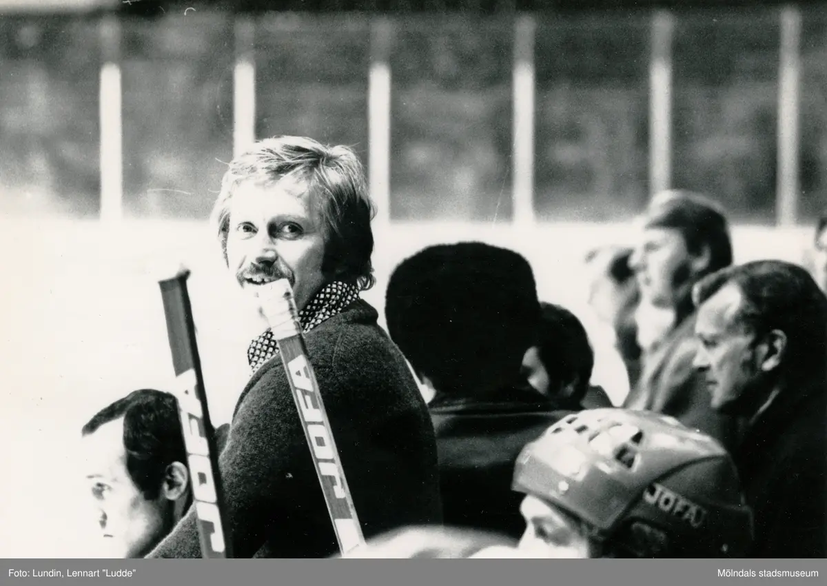 Ishockeyspelare samt ledare i Mölndals IF i avbytarbåset. Fotografiet är möjligen taget vid Mölndals konstisbana vid Ågatan i Trädgården, Mölndal, ca 1970-1976.
