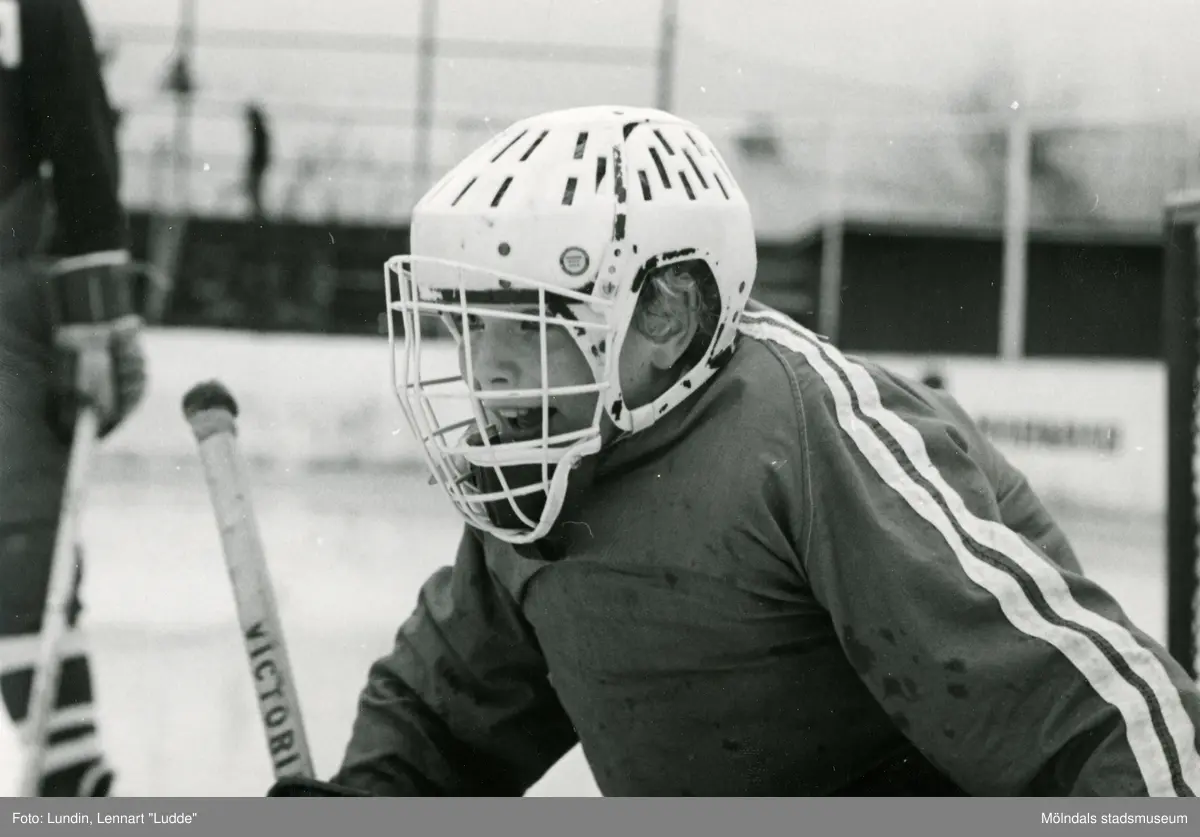 En ung ishockeymålvakt på ishockeyskolan. Fotografiet är taget vid Mölndals konstisbana vid Ågatan i Trädgården, Mölndal, ca 1970-1976.