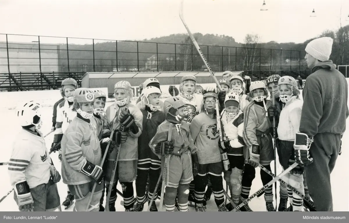 Unga ishockeyspelare på ishockeyskolan. Ledare är Per Adolfsson. Fotografiet är taget vid Mölndals konstisbana vid Ågatan i Trädgården, Mölndal, ca 1970-1976.