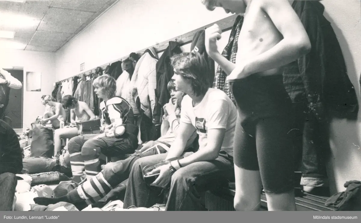 Ishockeyspelare från Mölndals IF i ett omklädningsrum. Fotografiet är möjligen taget vid Mölndals konstisbana vid Ågatan i Trädgården, Mölndal, ca 1970-1976.