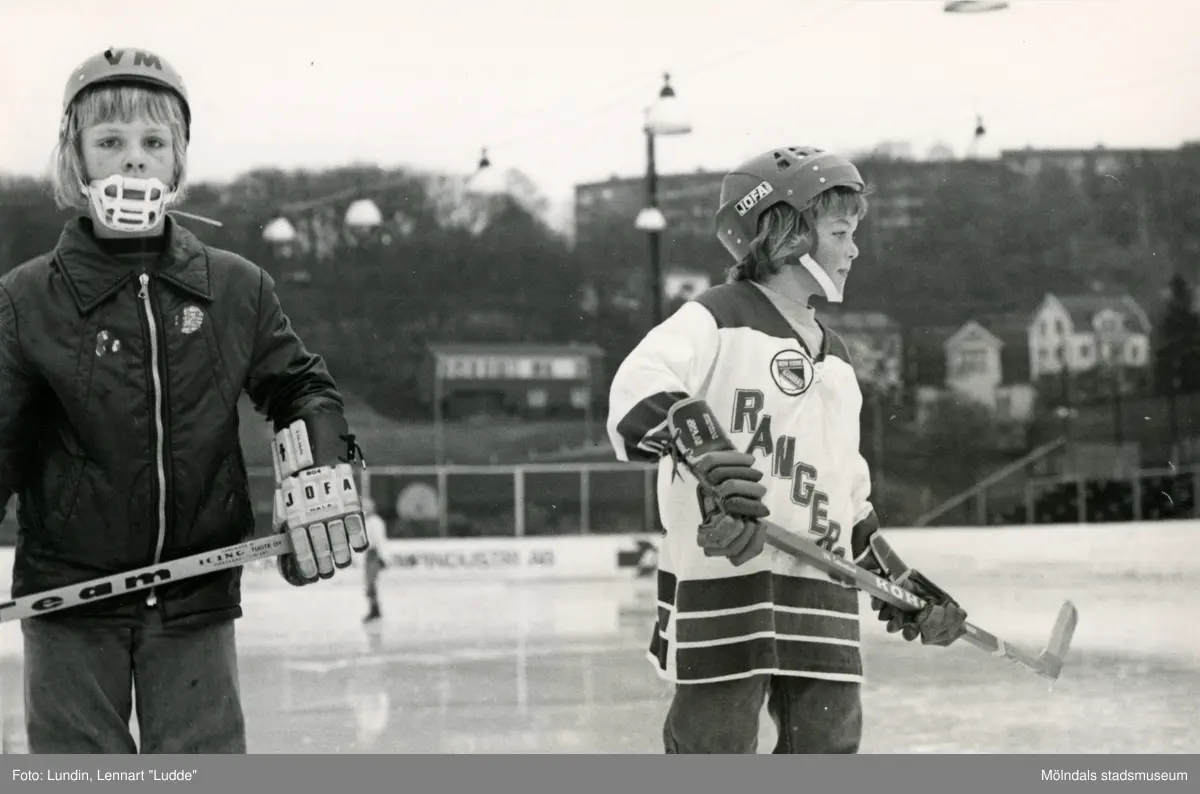 Två unga ishockeyspelare på ishockeyskolan. Fotografiet är taget vid Mölndals konstisbana vid Ågatan i Trädgården, Mölndal, ca 1970-1976.