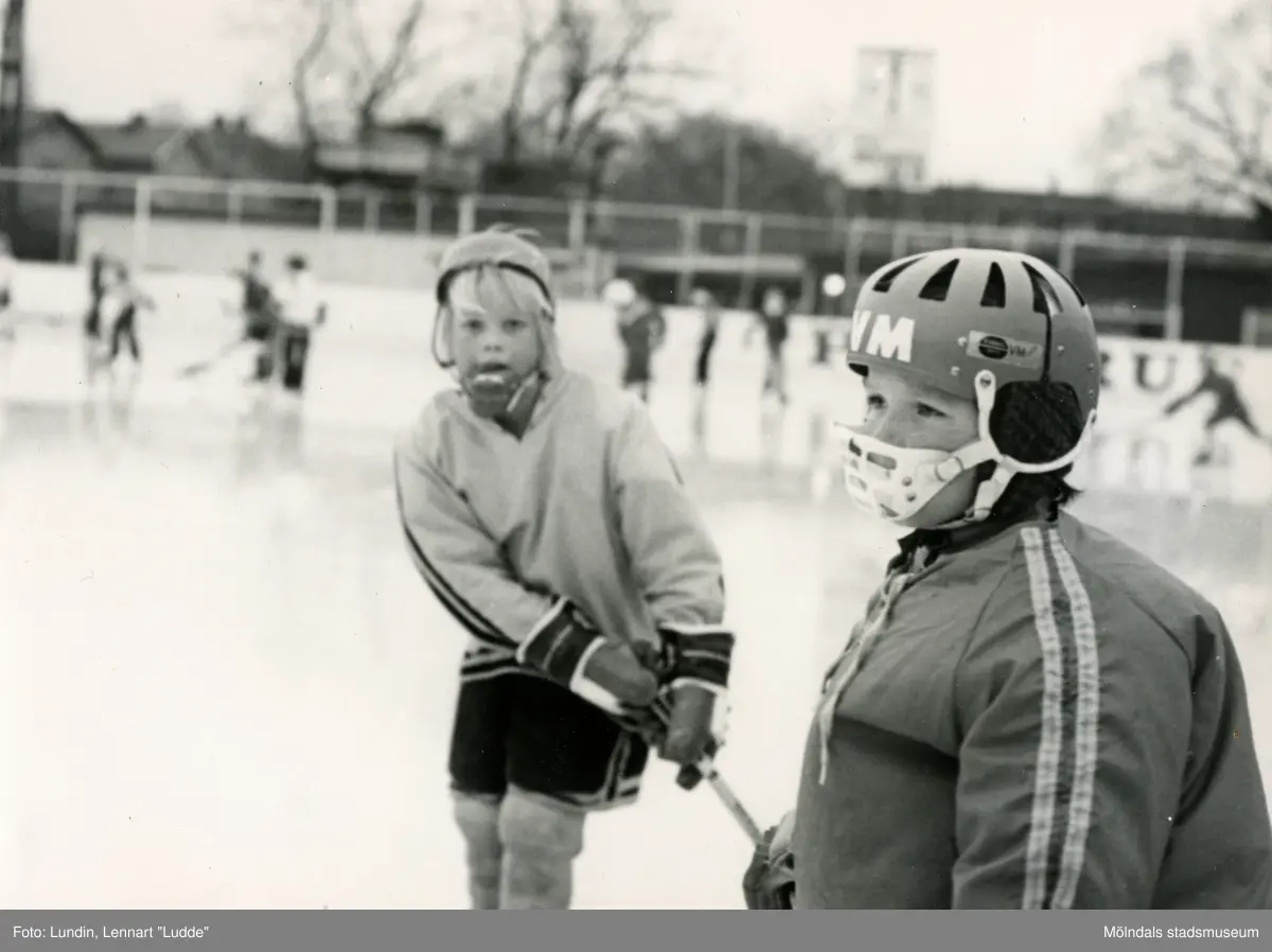 Titel: Två unga ishockeyspelare på ishockeyskolan. Fotografiet är taget vid Mölndals konstisbana vid Ågatan i Trädgården, Mölndal, ca 1970-1976.