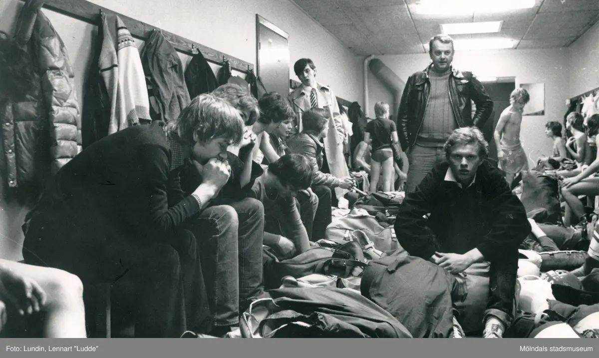 Ishockeyspelare från Mölndals IF i ett omklädningsrum. Fotografiet är möjligen taget vid Mölndals konstisbana vid Ågatan i Trädgården, Mölndal, ca 1970-1976.