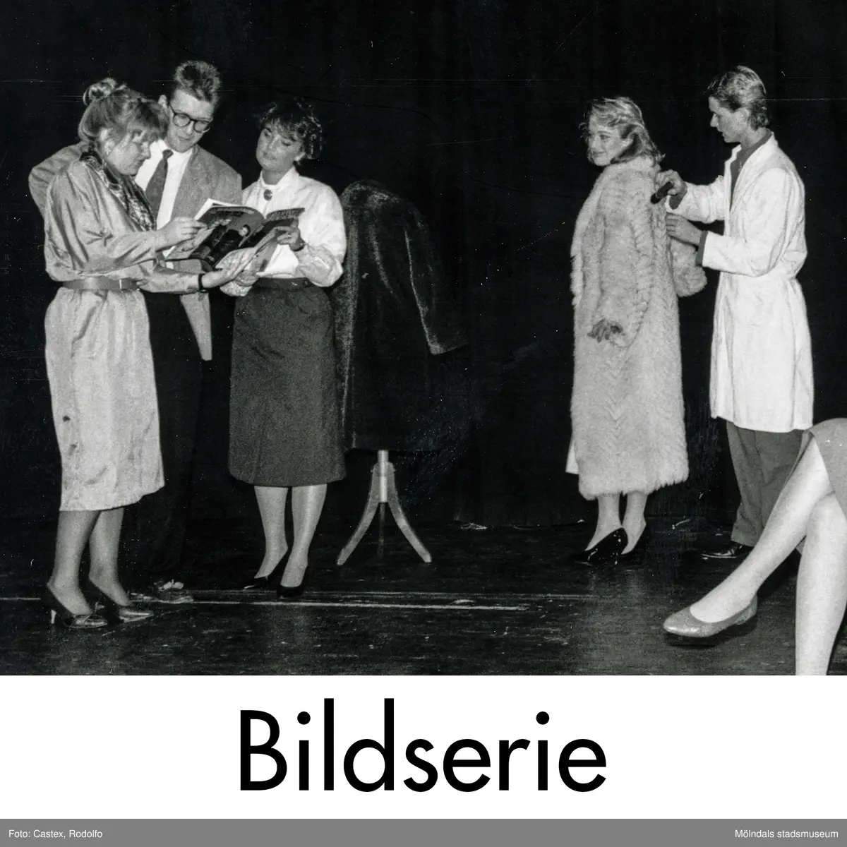 Serie om fem svartvita fotografier som visar repetition av en teateruppsättning på Möllan i Mölndal, okänt årtal.
