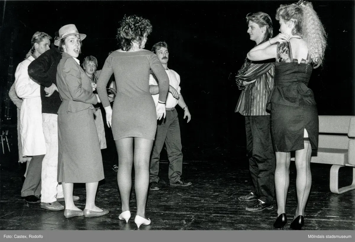 Repetition av en teateruppsättning på Möllan i Mölndal, okänt årtal. Janne Sandberg i bildens mitt.