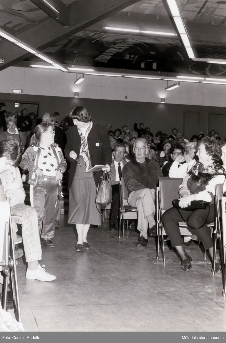 En sammankomst för Unicef i Fässbergsgymnasiets aula i Mölndal, slutet av 1980-talet eller början av 1990-talet. Bland deltagarna ses ordföranden i svenska Unicef-kommittén Lisbeth Palme.