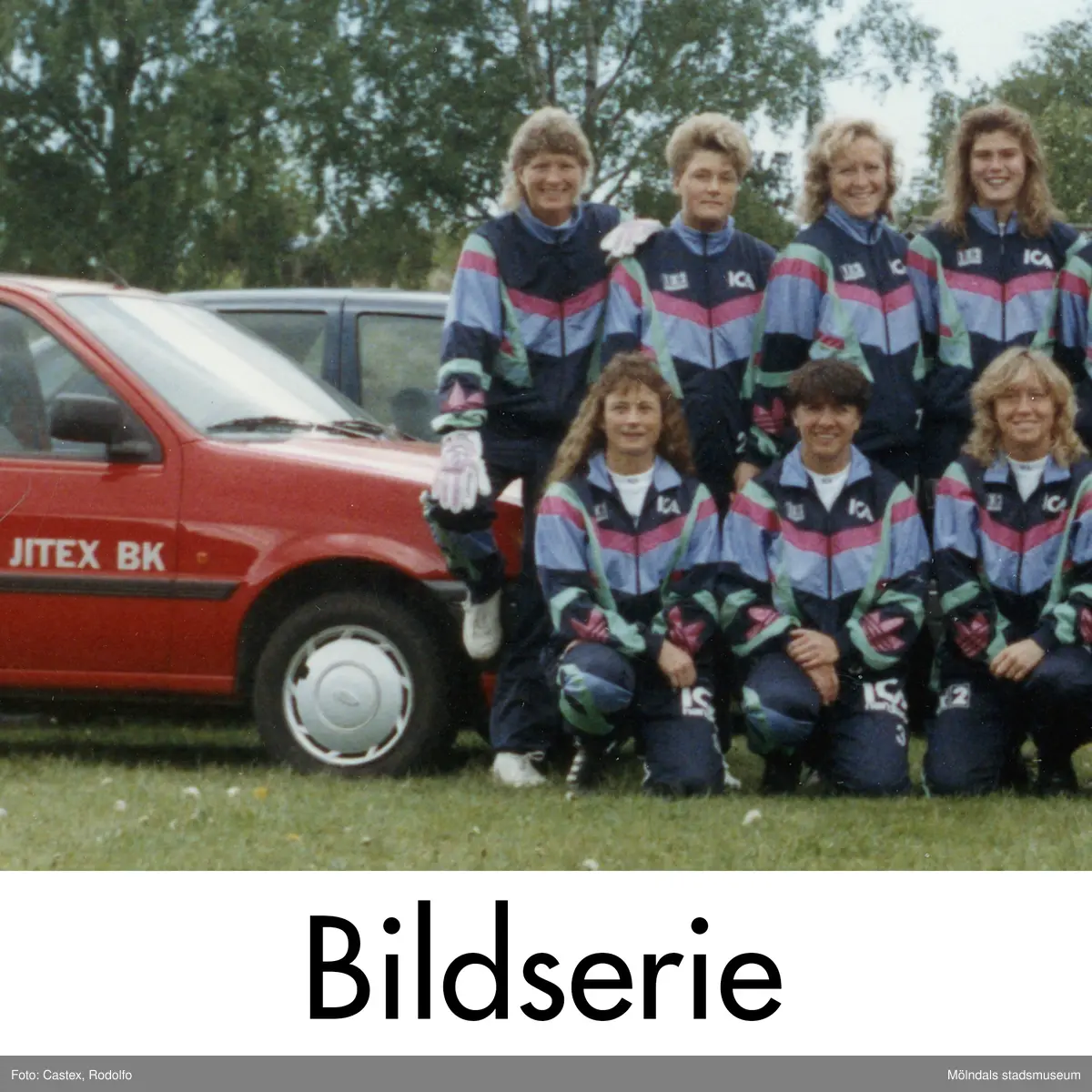 Serie om fyra fotografier som visar fotbollslaget Jitex BK på Krokslättsvallen i Mölndal, juli 1991. Lagbilder samt bild på sponsorbilar från Ford Motorverken.
