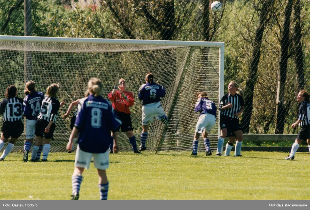 Fotbollslaget Lindome GIF spelar match mot Jitex BK i maj 2000. Möjligen på Lindevi IP i Lindome, Mölndals kommun. Slutresultatet är okänt.
