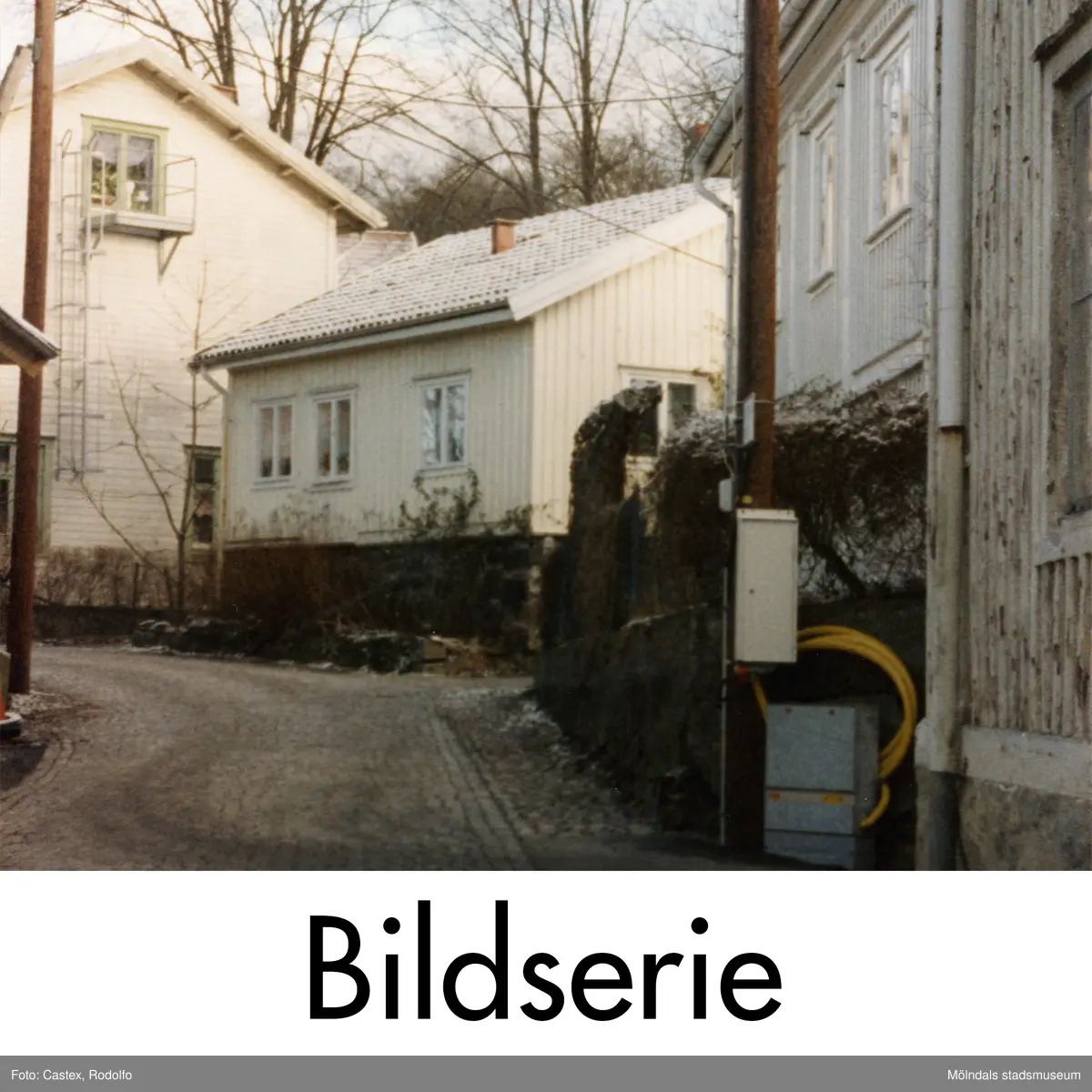 Serie om 27 fotografier som visar bebyggelse i Mölndals Kvarnby samt Mölndalsfallen, tagna i januari 1999.