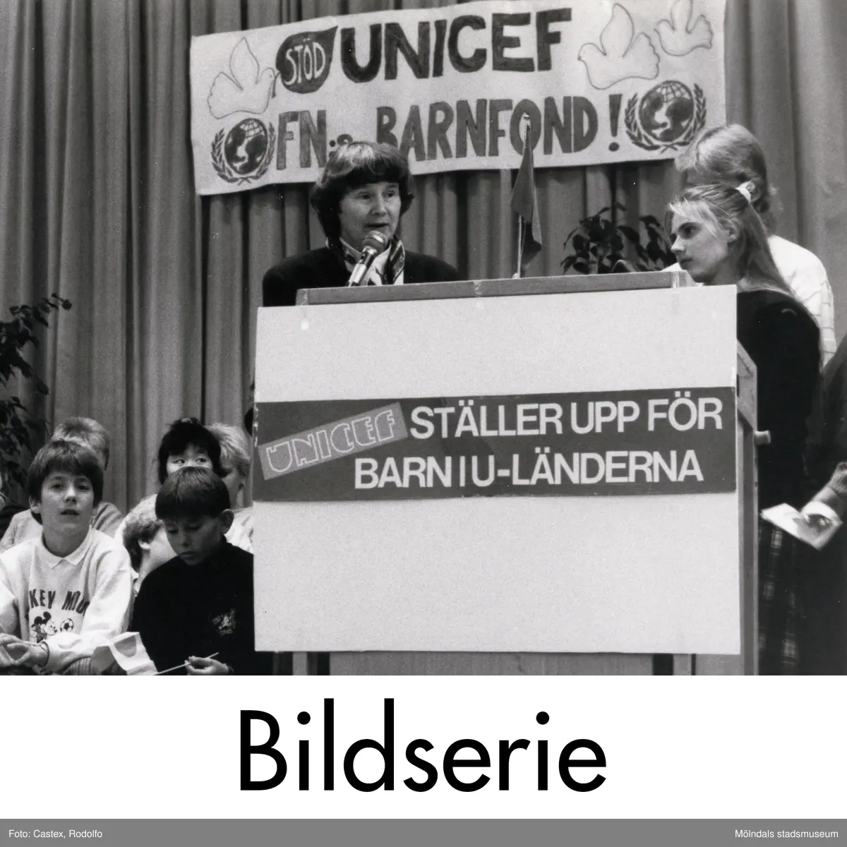 Serie om 19 svartvita fotografier som visar en sammankomst för Unicef i Fässbergsgymnasiets aula i Mölndal, slutet av 1980-talet eller början av 1990-talet. Bland deltagarna ses ordföranden i svenska Unicef-kommittén Lisbeth Palme.