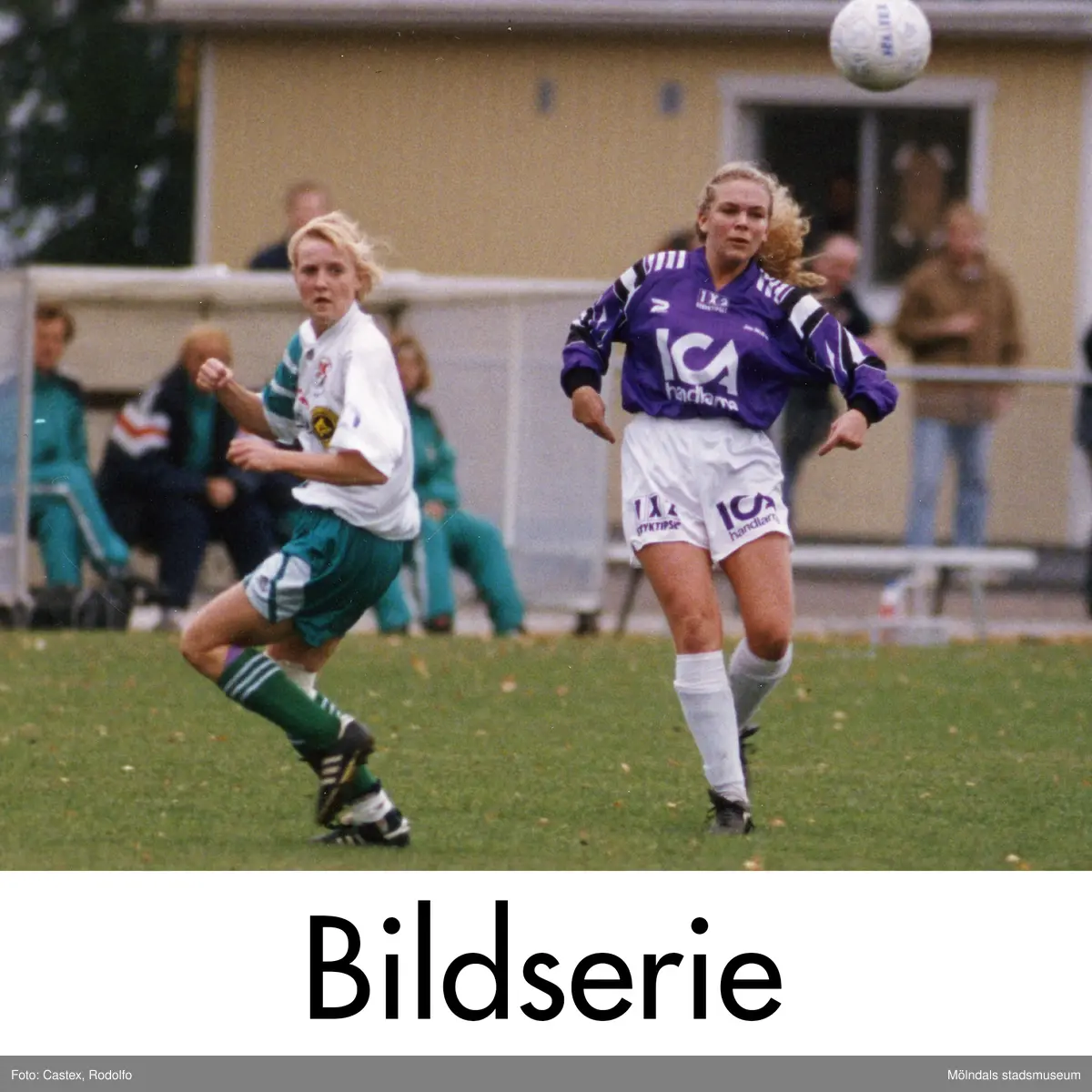 Serie om tre fotografier som visar fotbollslaget Jitex BK spela match mot Wä IF på Kvarnbyvallen i Mölndal, år 1994. Slutresultatet är okänt.