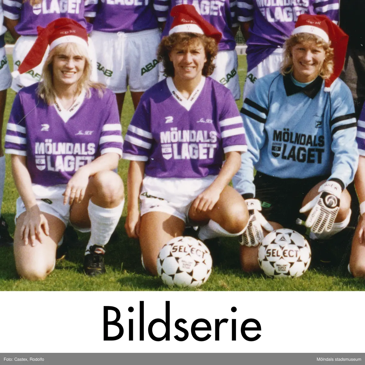 Serie om tre fotografier som visar lagbilder av fotbollslaget Jitex BK på Kvarnbyvallen i Mölndal, år 1988. På en av bilderna har spelarna på sig tomteluvor, på en annan har de Scandic-kepsar på sig.