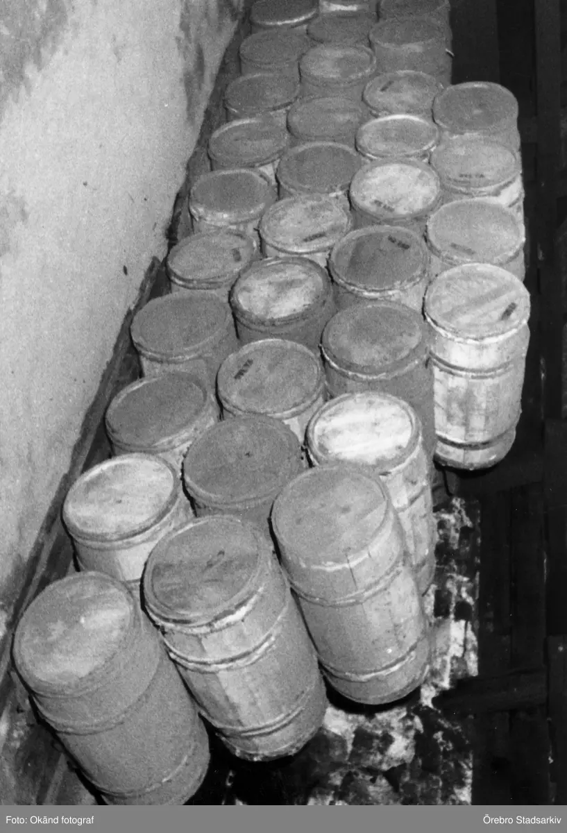 Tunnor för rödfärg tillverkade i Dylta Bruks tunnbinderi, ca 1971