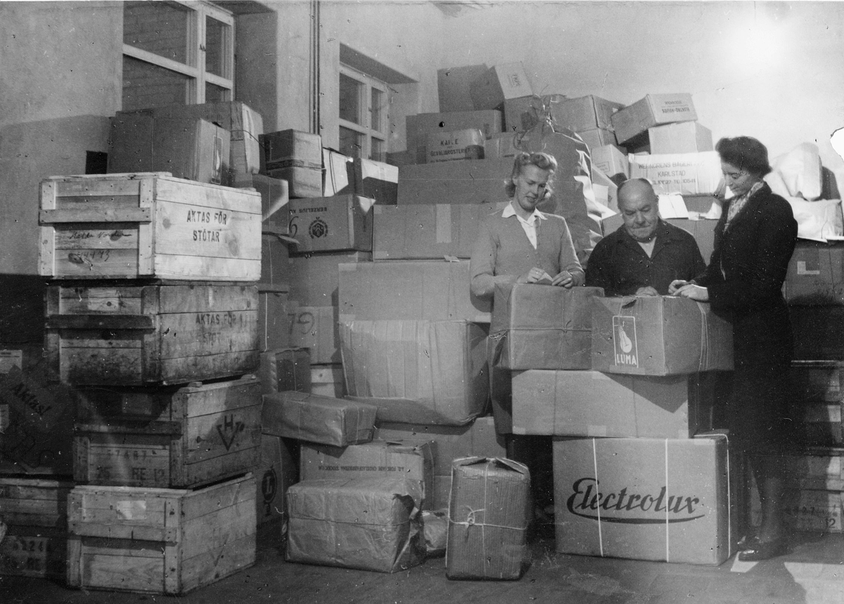Posttjänstemännens i Sverige klädinsamling till norska och finska kolleger, år 1945. Längst t.h. Stava-Lisa Gromark, insamlingens allt i allo, med två av sina medhjälpare, herr Brolin och fröken Edsbäcker.
