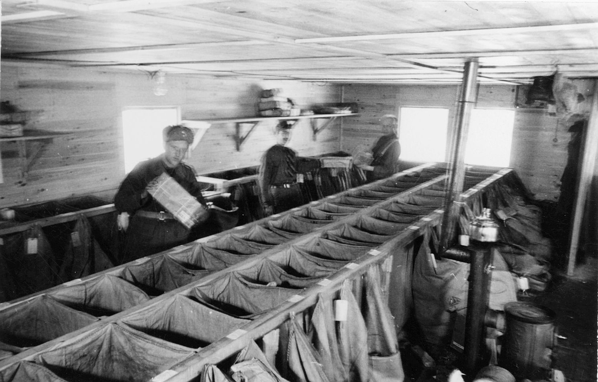Svenska Frivilligkåren i Finland. Fältpostkontor i Tornio, 1940. Paketexpeditionen.