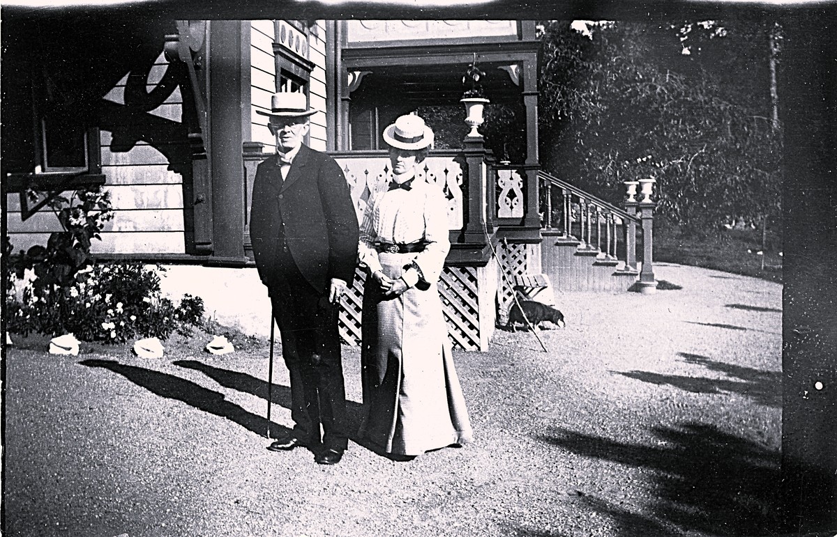 Foto av Per Johan Haegerstrand och Hildur Karolina Lagerholm vid Gröndal. Text baksida kort: "Gröndal, Gefle. Morfar och mamma troligen 1903. Lennarts? mormor och mormors far".