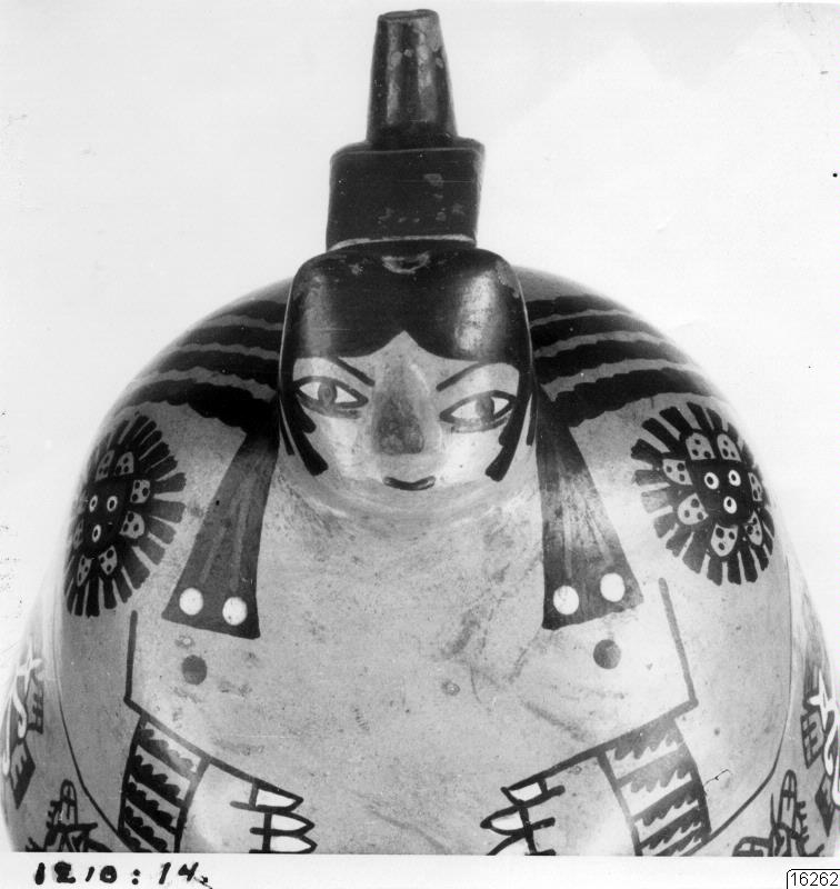 Motiv: Arkeologiskt Nazcakärl, nr 034428, i Museo Etnográfico, Buenos Aires. Fotos (foton) av Dr Carl Schuster, Woodstock, N.Y. 1954 och 1966, de senare på uppdrag av H. Wassén vid GEM (Göteborgs Etnografiska Museum), som vid besök i Buenos Aires 1966 frapperades av yttre likheten med GEM:s Nazca-kärl 1935.32.0047. Schuster har gjort en förstoring (neg.nr. 120927) av en "shoulder-decoration" för sitt intresse av stiliserade människohuvudsframställningar med omgivande troféhuvuden. Se hans brev från 1967-02-09 i korrespondensen.