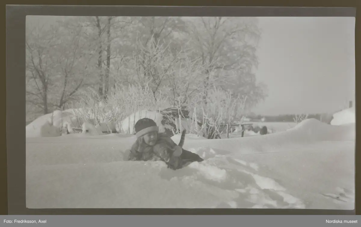 Frida Anna Elisabeth (kallad Anna-Lisa) Fredriksson leker i snön med en katt.