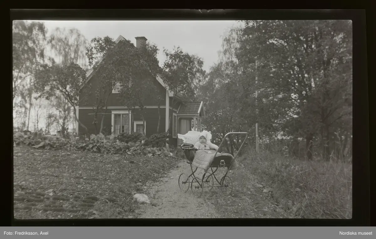Ett litet barn sitter i en barnvagn som står trädgårdsgången fram till ett hus.