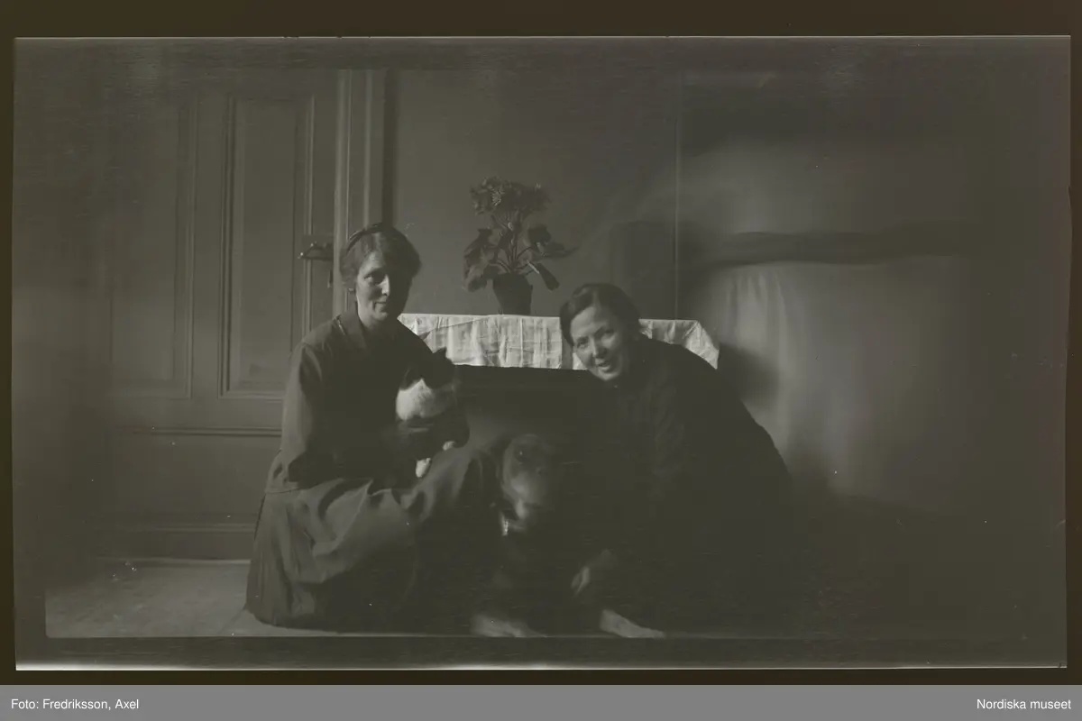 Två kvinnor sitter på golvet i ett rum med en hund emellan sig. Den ena kvinnan har en katt i famnen.