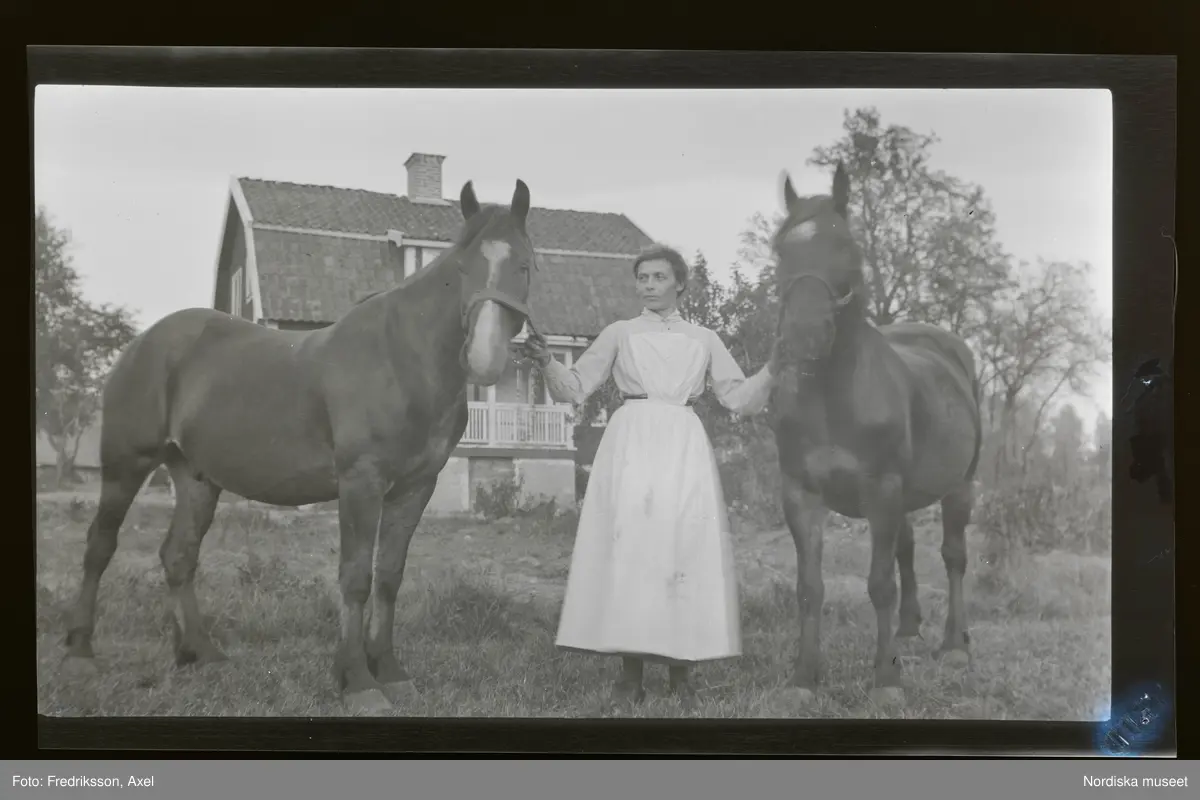 En kvinna står mellan två hästar hon håller i vardera hand.