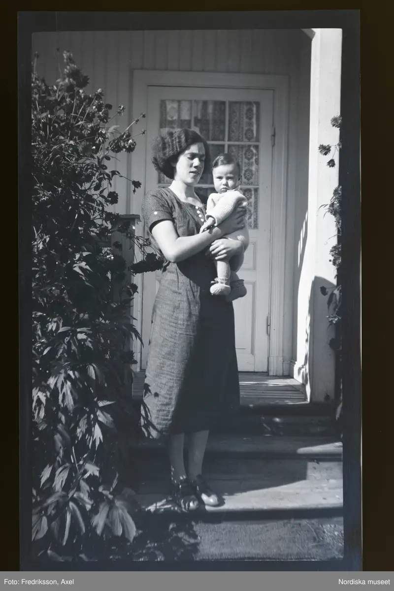 En kvinna står med ett litet barn i famnen på trappen till ett hus.