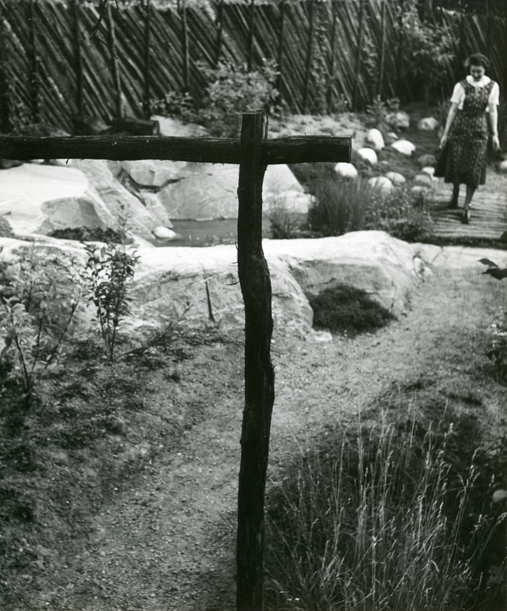 Trädgårdsmiljö i Sverige, omkring 19401950-tal. En kvinna promenerar över en liten träbro bland sten och växter.