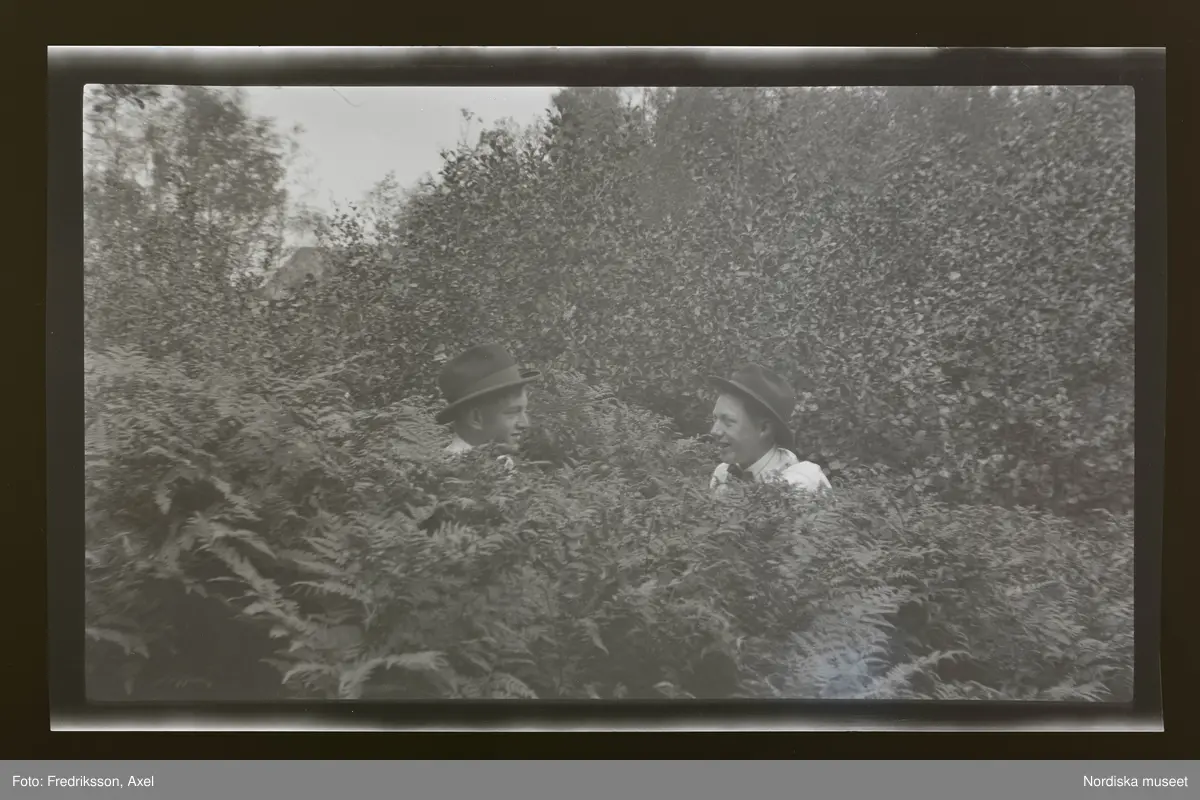 Två ungdomar sitter bland ormbunkar i en trädgård.