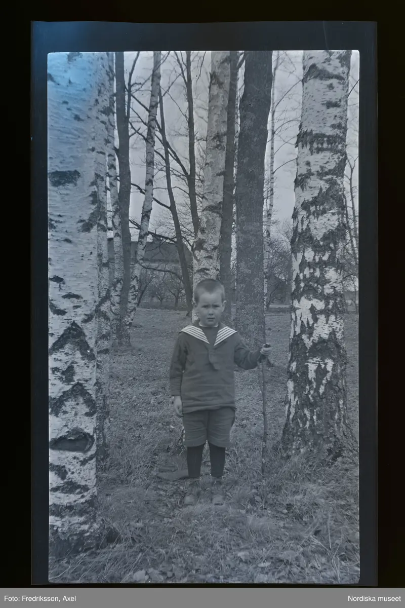 En liten pojke står bland björkar.